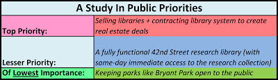 . . . Same-day immediate access to a complete research collection was important enough to close Bryant Park for more than four years, but selling off public libraries to generate real estate deals is more important than same-day immediate access to a complete research collection? That makes generation of real estate deals more important than keeping our public parks open to the public! Is the next step going to be to suggest the selling off of the park for real deals?